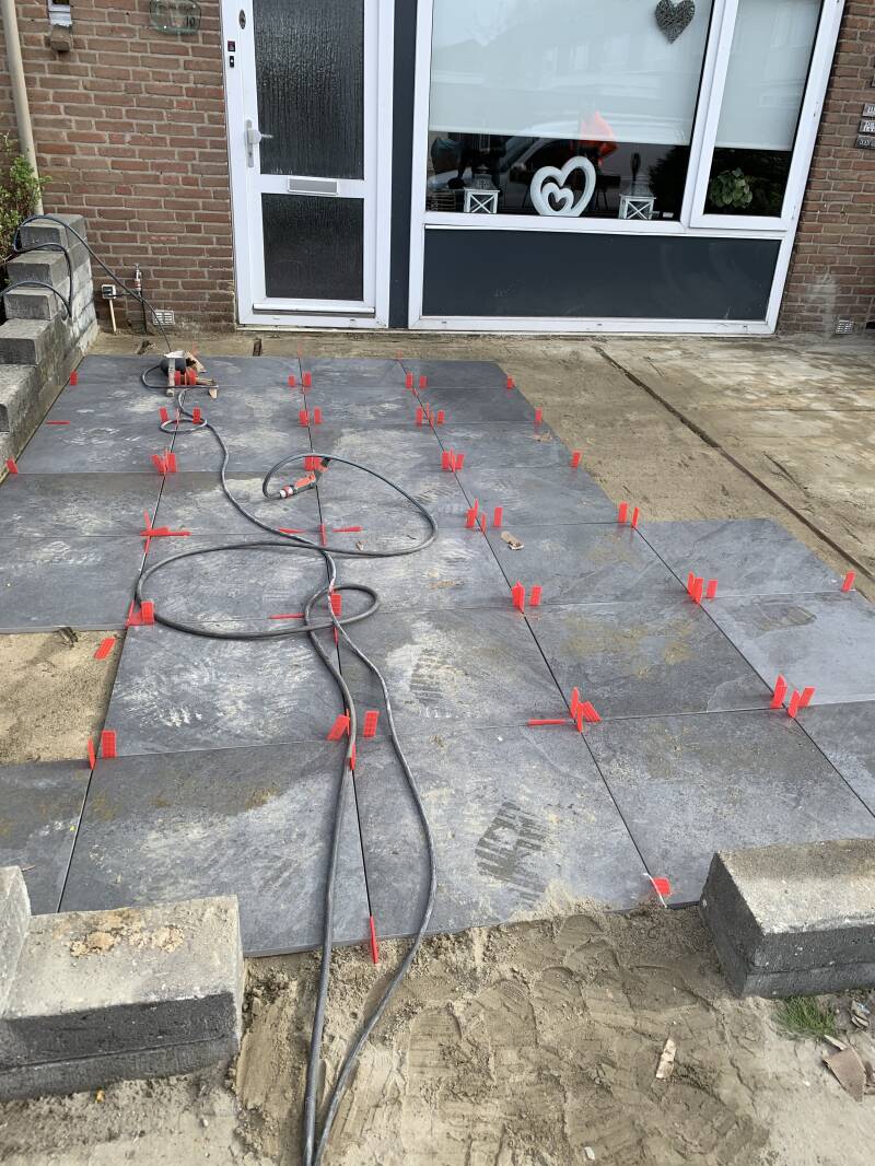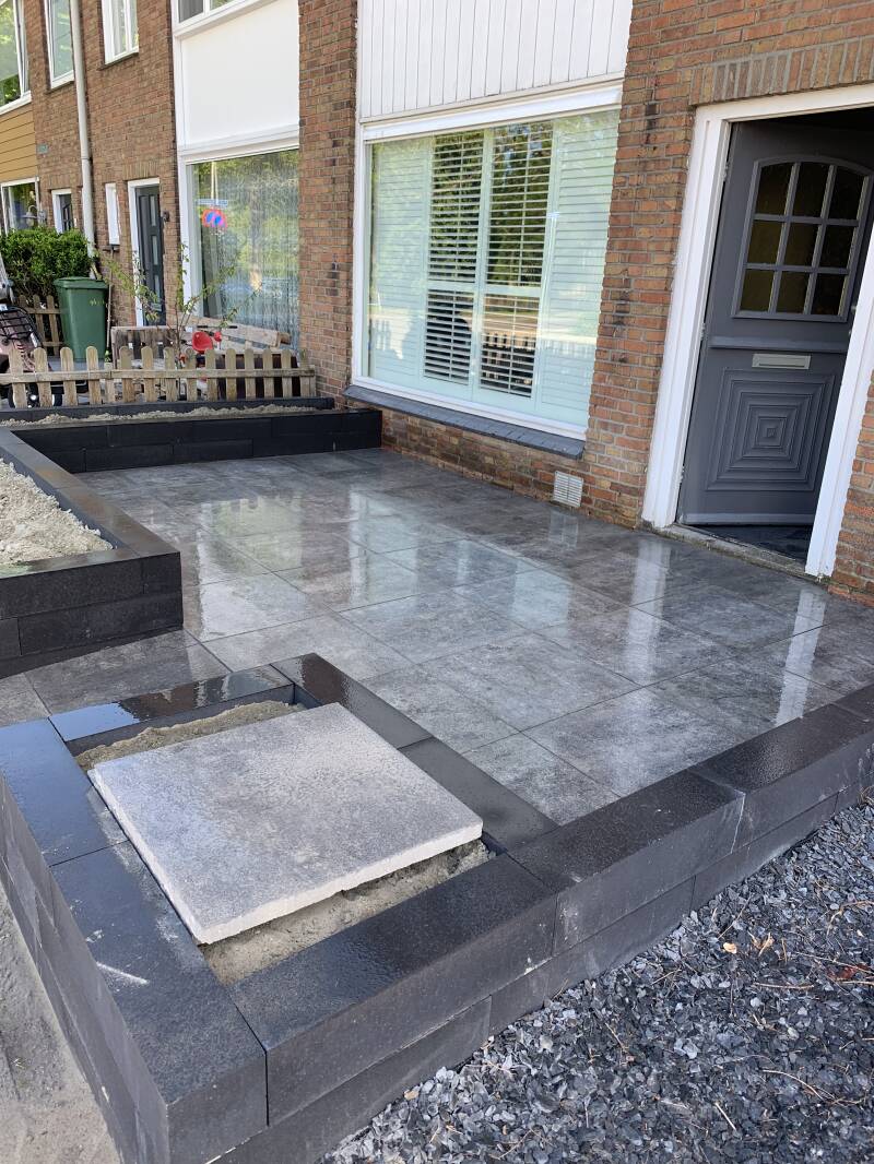 Tuin voorzien van nieuwe bestrating 60x60 , keramische houtlook tegels120x40 , bloembak , borders , watervoorzieningen en stroomvoorzieningen.