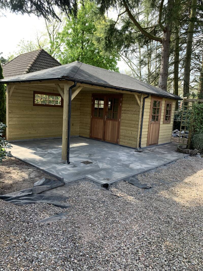 Tuinhuis voorzien van nieuwe bestrating rondom , nieuwe dakgoten en drainage putten.