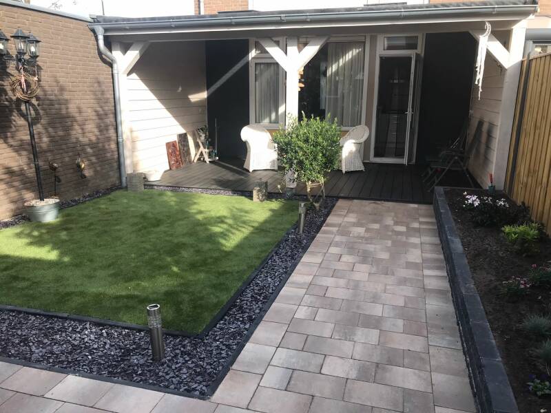 Tuinrenovatie incl nieuwe afwatering, slim line drainegoten, kunstgras en 60x60 tegels .