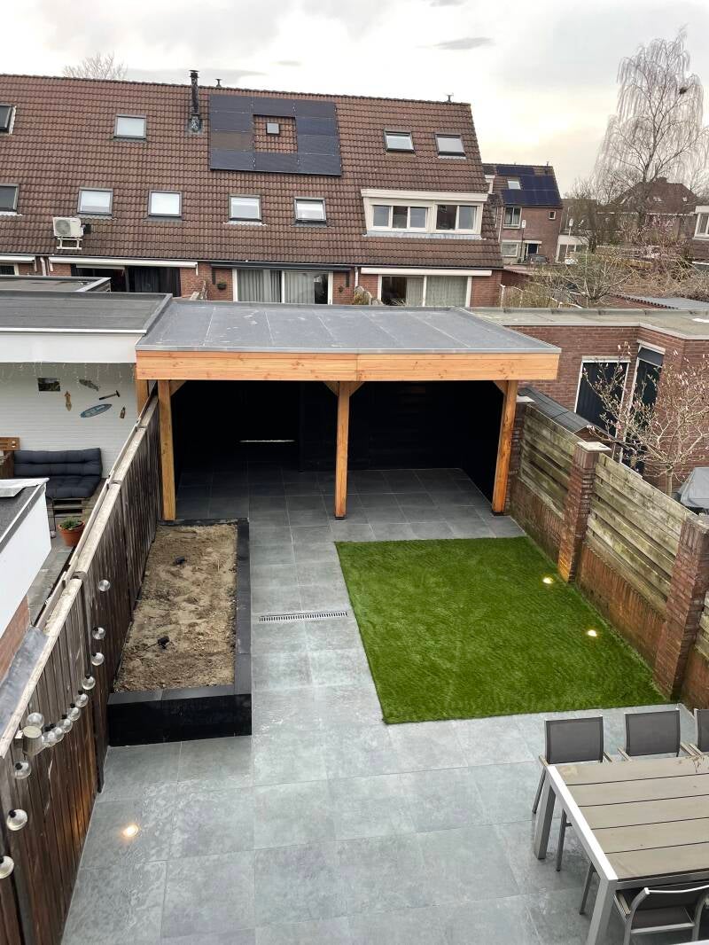 Nieuwe overkapping incl herbestrating gebakken klinkers en stroomvoorzieningen .