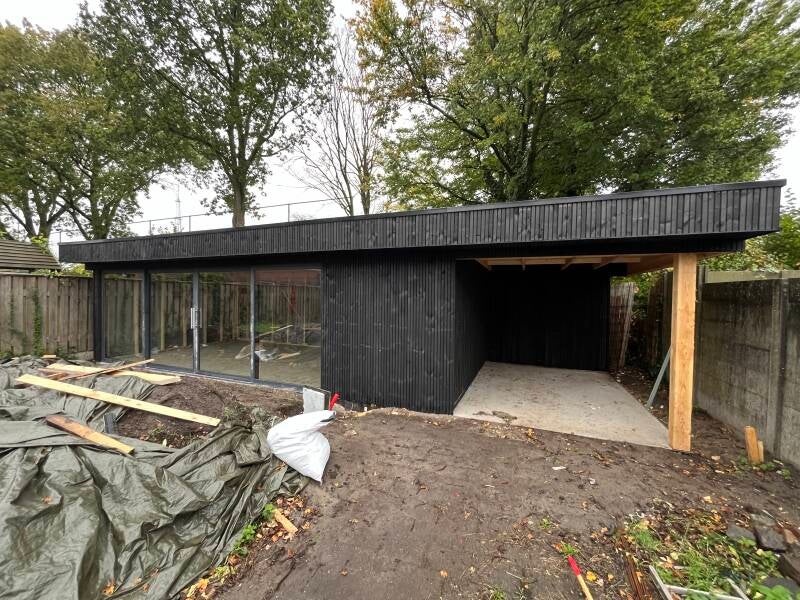 garage omgebouwd na tuinkamer incl schuur nieuwe schutting en nieuwe tuin .